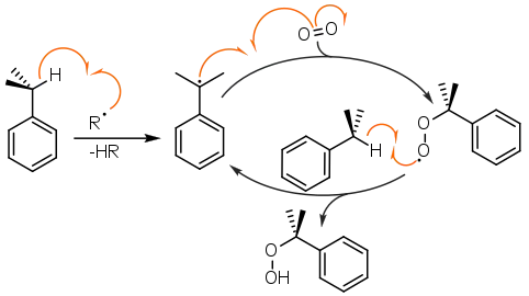 Така реакція використовується в промислових масштабах, наприклад, в куменовому методі.[17] Подібна радикальна реакція, спонукована атмосферним киснем, також може повільно відбуватись у речовинах, що можуть утворювати стійкі радикали. Наприклад, це призводить до самоокислення розчинників з групи простих ефірів, таких як діетиловий ефір, диізопропіловий ефір, тетрагідрофуран або 1,4-діоксан. Продуктами є гідропероксиди простих ефірів, які можуть стати причиною сильних вибухів при нагріванні або концентруванні.[14]