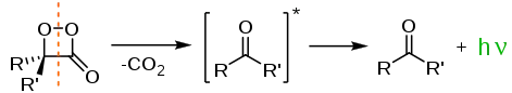 Пероксиди також грають роль у процесі біолюмінесценції. У світлячкових окислення люциферинів, яке каталізується люциферазами, дає пероксисполуку 1,2-діоксетан. Діоксетан нестійкий і спонтанно розпадається до вуглекислого газу та збудженого кетону, який повертається до основного електронного стану, випромінюючи світло.[27]