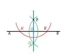 Крок 1: (червоний) За допомогою циркуля проведемо півколо з центром у точці P, і отримаємо на перетині з прямою точки А' і В'.