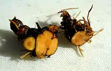 Викопують їх пізно восени або напровесні, одразу після розтавання ґрунту. Їх ретельно миють, очищаючи від дрібних корінців та коричневої шкірки, розрізають упродовж. Спочатку шматки підсушують на повітрі, а потім у печах. Для одержання круп молоти кореневища треба кілька разів, пропускаючи через м'ясорубку.[3]