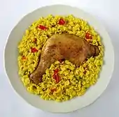 Назва страви аррос-кон-польйо перекладається з іспанської як «рис та курка». Популярна в Латинській Америці страва на зразок паельї, яка має в країнах регіону свої особливості. У складі - курятина, рис, шинка, помідори, перець, горошок, спеції та ароматні прянощі. Для кольору додають шафран або куркуму.