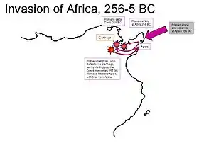 В 255 р. пунійці за допомогою грецьких найманців під командою спартанця Ксантиппа зуміли завдати римській армії нищівної поразки, а римський флот із залишками розбитої армії потрапивши по дорозі назад в сильний шторм майже цілком загинув.