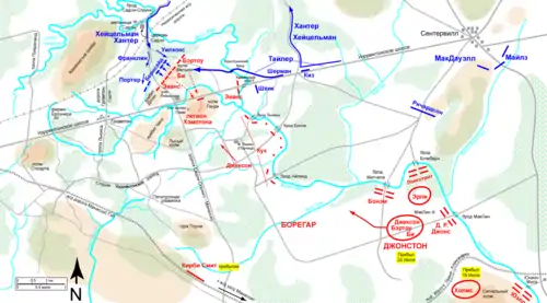 Командування армії Півдня ще нічого не знало про становище свого лівого флангу. Джонстон і Борегар перебували на пагорбі біля переправи Мітчелл-Форд, чекаючи результатів наступу на Сентервілл. До них надійшло повідомлення Александера про наступ флангової колони, але вони сподівалися, що їх атака випередить федеральний наступ. О 10:30 з'ясувалося, що наказ про наступ з якоїсь причини не доставлено за призначенням і що бригада Юелла ще не зрушила з місця. О 11:00 канонада на лівому фланзі посилилася, а пікети донесли, що федерали споруджують завали під Блекбернс-Форд і Мітчелл-Форд і, отже, не планують атаки з цього боку. Розуміючи, що найважливіше відбувається на лівому фланзі, Джонстон і Борегар вирушили туди[46].