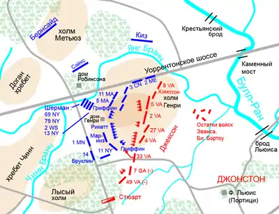 11-й Нью-Йоркський піхотний полк — «Вогненні зуави» — встав позаду гармат Рікеттса. Морські піхотинці розташувалися лівіше, а 1-й Мінесотський — правіше. 14-й Бруклінський затримався біля переправи через Янг-Бренч, а 38-й Нью-Йоркський піднявся на пагорб і встав лівіше будинку Генрі, де опинився навіть раніше, ніж батарея Гріффіна. Розгорнулася запекла гарматна перестрілка на короткій дистанції. Генерал Джексон роз'їжджав уздовж своєї піхотної лінії, повторюючи: «Все добре …» «Він здавався дуже спокійним, — згадував рядовий 5-го Вірджинського, — і ми вирішили, що дійсно все в порядку і що зазвичай битви так і виглядають»[68].