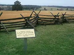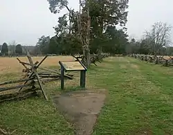 Оригінальний текст (англ.)– Just about daylight I nociced two of the enemy's vedettes coming over the hill through the broomsedge. They were carrying their guns at trail arms, and, although coning in our direction, they did not see us, for they had their attention on the men at the Stone Bridge. Press Cowan and I ... walked up to the fence by the edge of the field, about 40 feet from the bank of Bull Run. The vedettes came on until they were within a hundred yards of us. I laid my gun down across the top rail and ran my eye down the barrel. At that instant Press Cowan, who was standing a step behind me, fired. This was the first musket fired at the Battle of Manassas. It was fired by Press Cowan, a private of Co. J, of the 4th South Carolina Infantry. It was about £00 yards below the Stone Bridge and about 40 feet from the bank of Bull Run, on the Centreville side, about 6 o'clock in the morning. .— [29]