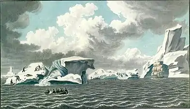 Нижче 60° пд. ш. зустріли серію айсбергів. Беллінсгаузен порахував і записав у своїх нотатках, що питної води з найбільшого айсберга вистачить всьому населенню Землі (на той час воно складало 845 млн осіб) на 22 роки і 86 днів (у розрахунку по одному відру на день).