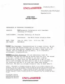 Під тиском звинувачень Білий дім був змушений опублікувати стенограму розмови Трампа із Зеленським, яка підтвердила, що Трамп просив Зеленського «розібратися» в питанні щодо Байдена[14]. Джо Байден є одним з найбільш вірогідних суперників Трампа на президентських виборах 2020 року[15][16].