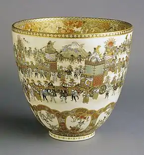 Посуд Сацума — назва, яку спочатку давали кераміці з провінції Сацума, вишукано прикрашеній позолотою та емаллю. Ці вироби високо оцінили на Заході, де він розглядався як виразно японський, він і насправді багато у чому завдячував імпортним пігментам та західним впливам та був створений з урахуванням експорту. Подібні вироби почали виготовлятися у багатьох містах для задоволення попиту на нього Європи та Америки, при цьому часто виробляючи швидко та дешево. Тож термін «посуд Сацума» став асоціюватися не з місцем походження, а з низькоякісним посудом, створеним виключно для експорту. Незважаючи на це, митці, такі як Ябу Мейзан та Макудзу Козан, продовжували дотримуватися найвищих художніх стандартів, й одночасно успішно експортували свої вироби. У 1876–1913 роках Козан завоював призи на 51 виставці, включно із Всесвітньою виставкою та Національною промисловою виставкою[5].