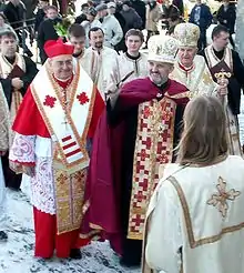 | Єпископ Петер Руснак (в центрі) після хіротонії 16 лютого 2008 року; ліворуч кардинал Леонардо Сандрі, а праворуч кардинал Йозеф Томко | ||