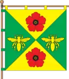 Квадратне полотнище поділене діагоналями на чотири частини. На верхній і нижній жовтих червоні квіти, на древковій і вільній зелених жовті бджоли.