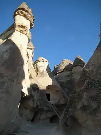 Тут, у Каппадокії — одне з дивовижних місць на світі. Гори з м'якого вулканічного туфу обдувається вітром і століттями, перетворюючись на те, що здається фокусами Антоніо Гауді, — в постаті химерних плавних обрисів, які, через брак лісу, служили укриттям і житлом. Дерево йшло тільки на двері. У цих скелях вирубували квартири і цілі багатоквартирні будинки з часів хетів.