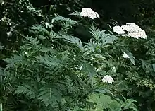 Багаторічна трав'яниста рослина 50–150(170) см заввишки; з повзучим кореневищем. Стебла прості або розгалужені вгорі, прямі, волохаті, залозисті. Листки до 25–30 см завдовжки і 15–16 см ушир, з довгасто-ланцетними, великозубчастими на краю частками. Кошики 5–7 мм в діаметрі, численні, зібрані в густе складне щиткове суцвіття. Променеві квіточки білі. Язичкові квітки 5–6 мм, білуваті. Плід — сім'янка[3][4].