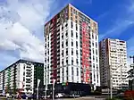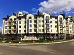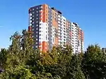 | ЖК «Синергія-2+» | Новооскольська, 2-Е, 2-Ж | 17-поверховий, двосекційний будинок на 406 квартир. Збудований за каркасно-монолітною технологією із заповненням газобетонними блоками й утепленням. Підключений до міських комунікацій, додатково оснащений фільтрами для очищення води[36]. Запланована здача комплексу затрималась майже на два роки. Будинок розташований у промзоні у безпосередній близькості до заводу «Ірпіньторфмаш». Виникли суперечки із сусіднім ЖК «Затишний», територією якого забудовник вирішив прокласти проїзд до комплексу. Найбільшою проблемою виявилось питання газопостачання[37]. За Державними будівельними нормами України 2001 року допускалася газифікація житлових будинків не вище 10 поверхів, за ДБН від 01.07.2019 — не вище третього[38]. В народі ЖК отримав назву «Титанік». 17-поверхова будівля, яка стоїть у колишній заболоченій місцевості, викликала занепокоєння щодо надійності, від чого виникли певні негативні асоціації із сумнозвісним пасажирським судном. | ![]() ЖК в народі прозвали «Титаніком» |