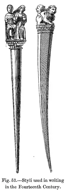 Одним з видів письмового приладдя, що застосовується рідше, є стилус, який використовується незрячими особами разом із дошкою для вибивання крапок шрифтом Брайля.[1]