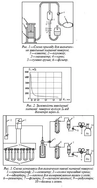 Питома поверхня порошкоподібних матеріалів характеризується дисперсним станом і необхідна для оцінки крупності і форми частинок, шорсткості поверхні, розрахунку адсорбційного покриття при дослідженні взаємодії мінералів з реагентами. Питома поверхня мінералів змінюється у широких межах і використовується як важливий показник при оцінки степені подрібнення і ефективності сепарації різними методами.