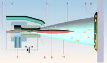 Газ подається при тиску в 2…3 ат, утворюється електрична дуга із силою струму 400…500 А і напругою 120…160 В, іонізований газ досягає температури 10…18 тис. °C, а швидкість потоку — до 15 000 м/с. Катодом служить неплавкий вольфрамовий електрод.