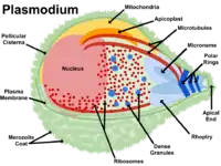 ![]() Плазмодій (його рухлива стадія - зоїт мігрує через епітелій кишечника москіта) | ||||||||||||||||
