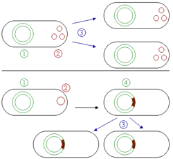 Плазміди можуть належати до більш ніж однієї з цих функціональних груп. Плазміди, які існують тільки у одній або декількох копіях в кожній бактерії, знаходяться у небезпеці при поділі клітини, тому що одній із дочірніх бактерій може не зостатися жодної копії. Такі плазміди мають системи, що намагаються активно доставити свої копії до обох дочірніх клітин.
