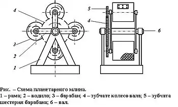 На осі кожного млина насаджені шестерні 5, які находяться у зачепленні з нерухомим зубчатим колесом 4. При обертанні водила барабанні млини обертаються відносно осі водила, а також навколо власних осей. Подрібнювальні тіла у барабанах знаходяться під дією додаткових відцентрових сил, які виникають при обертанні барабана навколо осі водила.