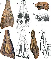 Череп крокодилоподібного Koumpiodontosuchus. Пластинчасту кістку — sp — видно на частині C2, вигляд черепа знизу