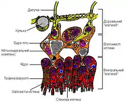 Тіло Placozoa складається з кількох тисяч клітин лише чотирьох типів: епітеліальні, волокнисті, залозисті та слизові. Внаслідок електронно-мікроскопічних досліджень на поверхні «спинного» епітелію виявлено численні мікроворсинки. Джгутики епітеліальних клітин Трихоплаксу занурені в глибоку ямку, стінки якої укріплені особливими опорними паличками. У епітелії з черевного боку трапляються залозисті клітини з вакуолями. У спинному епітелії містяться особливі клітини з кулястими включеннями, названі «блискучими кулями». Це великі заповнені жироподібною речовиною вакуолі, які, імовірно, виконують захисну функцію, оскільки здатні викидатися з клітини назовні, відлякуючи своїм вмістом ворогів.