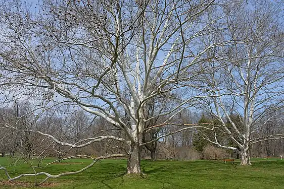 Платан західний — це могутнє, з масивним стовбуром, листопадне дерево заввишки до 35 метрів.