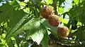 Голівки плодів, по 2–3 на ніжці, — 2–2,5 см завтовшки. Плід — багатогорішок, що лишається на дереві протягом всієї зими, й розпадається навесні на окремі горішки, що розносяться вітром.