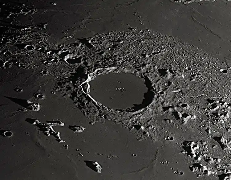 Платон (в центрі) в телескопічною фотографії (якщо дивитися з Землі)