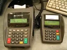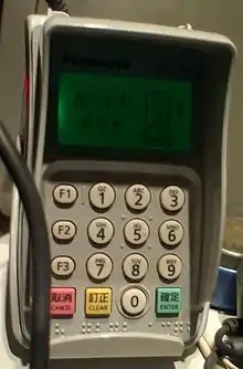 Як і банкомат, багато платіжних терміналів також оснащені піднятими тактильними кнопками та гніздом для навушників, які дозволяють сліпим чутно закінчити процес оплати.[9] [10]