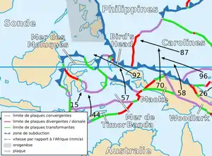 Плита відокремлена від Австралійської плити і маленької плити Маоке дивергентною границею на південному сході. Конвергентна границя на півночі відокремлює плиту Голова Птаха від Каролінської плити, Плити Філіппінського моря і Сундської плити на північному сході. Трансформаційний розлом відокремлює плиту Голова Птаха від Плити Молуккського моря на південному заході. Інша конвергентна границя відокремлює плиту Голова Птаха від Плити моря Банда на південному заході[2].