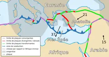 Затиснута між Африканською плитою з півдня, і Євразійською плитою на півночі. На півдні має зону субдукції південніше Криту, а на півночі має дивергентну границю яка утворює Коринфську затоку — Північноегейський розлом. На сході має дивергентну границю з Анатолійською плитою.