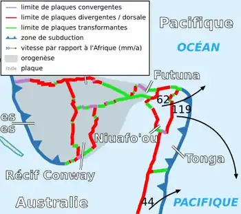 Плита обмежена зі сходу й півночі зоною субдукції Тихоокеанської плити, утворюючу жолоб Тонга. На заході має активний рифт або спрединговий з плитою Ніуафооу й Індо-Австралійською плитою. На півдні має трансформаційну границю з літосферною плитою Кермадек.