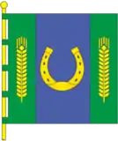 Квадратне полотнище, яке складається з трьох вертикальних смуг-зеленої, синьої та зеленої (співвідношення їхніх ширин рівне 1:3:1). На синьому тлі жовта підкова ріжками догори, обабіч, на зелених смугах, по одному жовтому колоску з зернами в ряд.