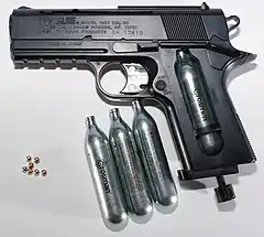 - Газобалонна пневматична зброя. Під газобалонною пневматикою мають на увазі зброю, у якій як робоче тіло використовується газ, відмінний від повітря (найчастіше вуглекислий), тобто клас це досить умовний. В основному джерелом живлення є 8, 12, 88-грамові балончики. Приклад: KWC 302s.