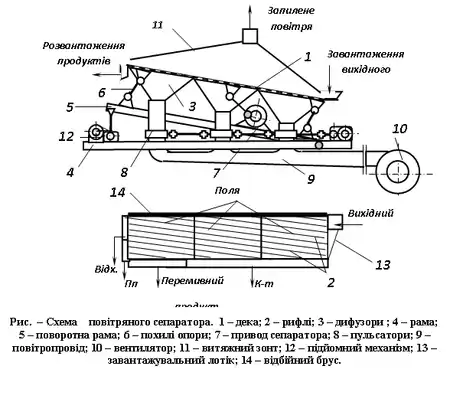 Пневматичний сепаратор СП-106 (рис.) складається з односхилої деки 1, яка розділена на три поля; дифузорів 3 для подачі повітря під деку; рами 4 і поворотної рами 5, похилих опор 6 і привода 7 сепаратора. На деці, що покрита рашпільними ситами з отворами трикутної форми розміром 3 мм, укріплені рифлі 2, розташовані під кутом до осі сепаратора. Дека розділена на три поля, під якими змонтовані дифузори 3, з'єднані повітропроводом 9 з вентилятором 10. Пульсуючий висхідний потік створюється пульсаторами 8, під якими встановлені дросельні заслінки, що призначені для регулювання подачі повітря під кожне поле.