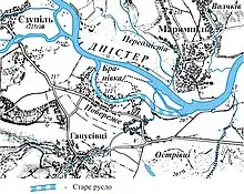 Рис.1. Карта Дністра з нанесеними новим та старим руслом
