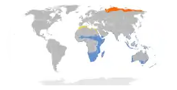 Зимує в тропічній області Старого Світу на південь до Австралії і Нової Зеландії.[3]