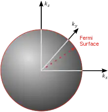 За принципом заборони Паулі два ферміони не можуть перебувати в одному стані. Тому в стані найнижчої енергії частинки заповнюють усі енергетичні рівні нижче енергії Фермі . Можна сказати це енергетичний рівень, нижче якого є точно заповнених станів. У оберненому просторі ці частинки заповнюють певний об'єм, поверхня якого називається поверхнею Фермі.[8] Поверхня Фермі ідеального фермі-газу є сферою (Рис.1), радіус якої (модуль хвильового вектора Фермі)