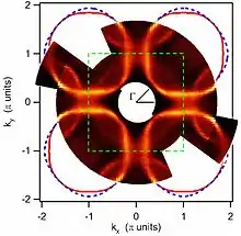Найбільш безпосереднім експериментальним методом для визначення електронної структури кристалів у просторі імпульс-енергія (див. Обернена ґратка) і, отже, поверхні Фермі, є фотоелектронна спектроскопія з кутовим розділенням (ARPES, Angle-resolved photoemission spectroscopy). Приклад поверхні Фермі надпровідних купратів, виміряних за допомогою ARPES, показаний на Рис. 3.