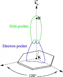 Поверхня Фермі матеріалів зі складною кристалічною структурою — складна періодична поверхня, яка у більшості металів безперервним образом проходить через всю обернену ґратку (відкрита поверхня Фермі). Замкнена поверхня Фермі періодично повторюється в кожній комірці оберненого простору. У тих випадках, коли в металі є декілька частково заповнених зон, поверхня Фермі розпадається на кілька поверхонь(за кількістю незаповнених зон), що розміщені в одній комірці.[6] Рисунок 2 ілюструє анізотропну поверхню Фермі графіту, який має на поверхні Фермі як електронні, так і діркові (з негативною ефективною масою) кишені через численні енергетичні зони, що перетинають енергію Фермі вздовж напрямку.