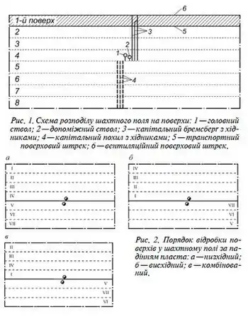 Відробка поверхів у шахтному полі здійснюється в певній послідовності як за лінією падіння пласта, так і за лінією простягання. За лінією падіння поверхи можуть відпрацьовуватися як зверху вниз, так і знизу вверх, тобто у низхідному або висхідному порядку, а також комбінованим способом (рис. 2).