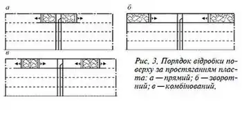 За лінією простягання відробка поверху може здійснюватися прямим, зворотним і комбінованим порядком (рис. 3). Якщо відробка запасів у поверсі ведеться в напрямку від капітального бремсберґа або похила до меж шахтного поля, то це називається прямим порядком відробки поверху (а), а від меж до бремсберґа або похила — зворотним (б). Комбінований поря-док відробки поверху (в) має ознаки як прямого, так і зворотного, тобто частина крила поверху відпрацьовується прямим порядком, інша — зворотним.