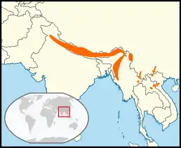 Вид поширений в гірських районах на півночі та сході Індії, в Непалі, Бутані, М'янмі, на півночі Таїланду, Лаосу та В'єтнаму, на півдні Китаю. Його природними середовищами існування є субтропічні або тропічні вологі низинні ліси та субтропічні або тропічні вологі гірські ліси.