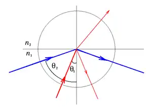 де n1 та n2 — показники заломлення середовищ (n1 > n2). В такому випадку світловий промінь не проникає далі й повністю відбивається від границі.