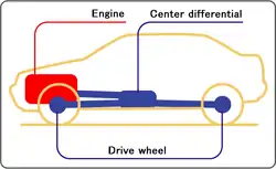 Двигун у колісній базі, повний привод, M4 (англ. Mid-engine, Four-wheel drive). Попри те, що двигун при такому компонуванні може бути розташований і попереду, і позаду салону, використовують, переважно, варіацію RM4, тобто двигун розміщений біля задньої осі. Зазвичай це компонування використовують тільки для спорткарів, суперкарів та гоночних автомобілів, бо вона є дуже складною і дорогою. Прикладом таких автомобілів є: