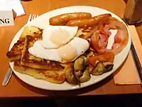 Це традиційний варіант такого сніданку, хоча можливі варіанти зі смаженими грибами, картопляними оладками, ковбасами — «білою» і «кров'яною».