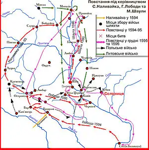 В грудні 1595 р. уряд Речі Посполитої вислав на приборкання повстання військові сили під командуванням польного коронного гетьмана Станіслава Жолкевського. В кінці січня 1596 року Наливайко з невеликим загоном (1500 осіб) відступив на Волинь, а звідти через уманські ліси до Білої Церкви. 23 березня (2 квітня) 1596 року загони С. Наливайка, М. Шаули, Г. Лободи об'єднались під Білою Церквою, де розгромили передові підрозділи шляхетських військ.