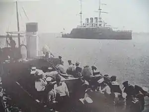 Командир наказав зіграти загальний збір і з такої нагоди сам рушив на місце шикування — на ют корабля. Команда броненосця вишикувалася там у звичайному для таких випадків порядку — по правому і лівому борту. Стройові офіцери, які були зобов'язані бути присутніми на подібних шикуваннях, зібралися біля кормового прапора, інші (інженери-механіки, корабельний священик) продовжували обідати в кают-компанії. Перед шикуванням капітан Є. М. Голиков зв'язався з міноносцем № 267 і наказав йому «бути готовим до походу»[18].