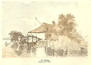В літературі згадується під назвами: «Пейзаж»[2]; «Хата над Днепром»[3]; «Хата над водою»[4]. В книзі І. Т. Кошового «Т. Г. Шевченко в Києві»[5] малюнок помилково датовано 1846 роком.