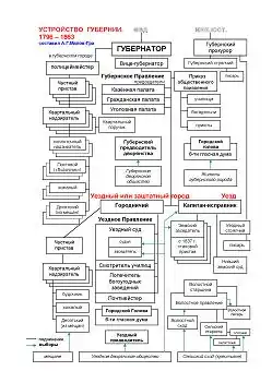 На схемі «Устрій губернії 1799-1863 рр.», опублікованої в книзі «Идентификация Петренко»[4] (с.165), історик А. Малов-Гра зобразив ієрархію основних установ і чиновників, що служили в цих губернських установах Російської імперії в першій половині XIX століття.